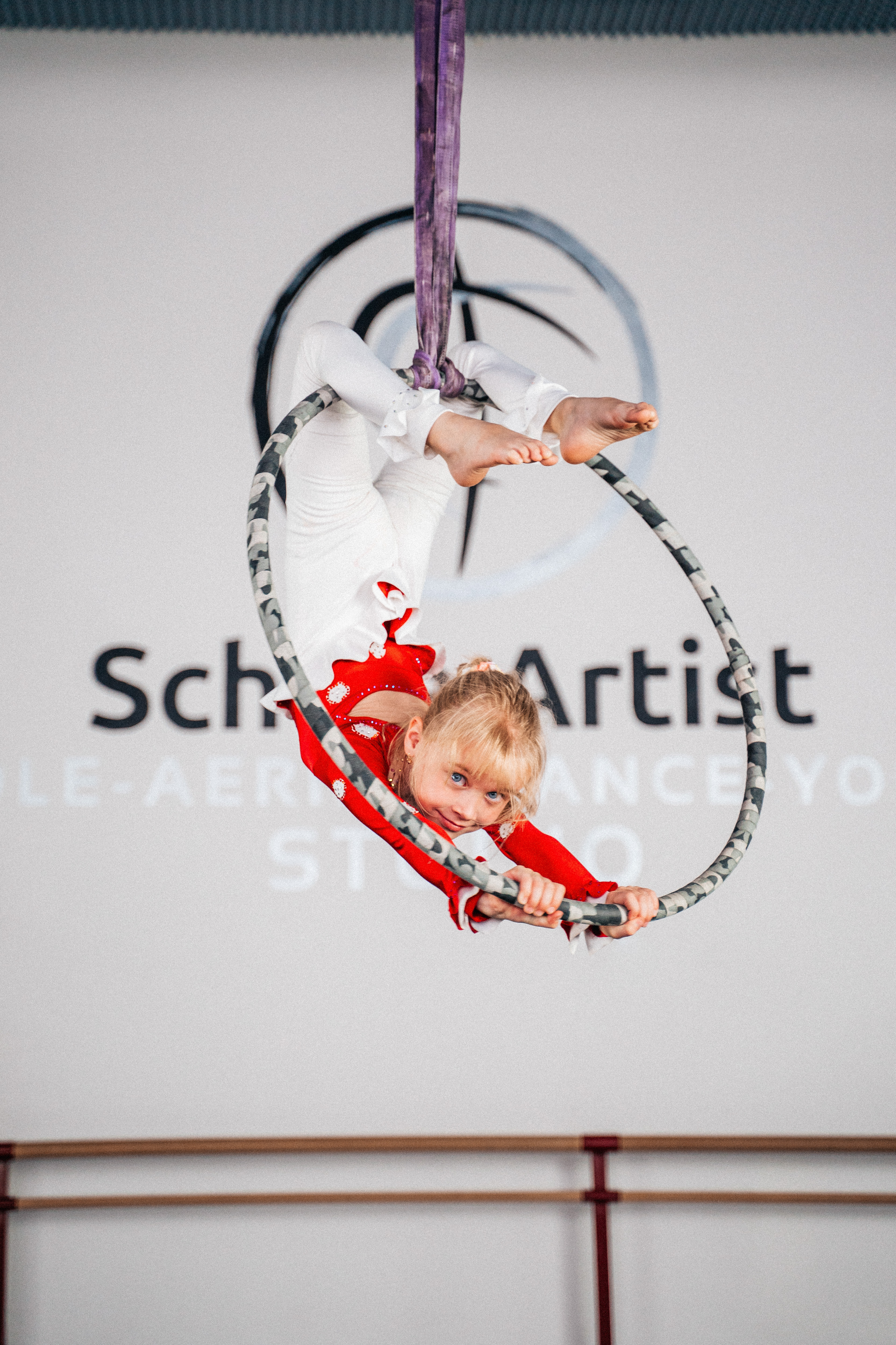 - Akrobatický tanec na vzdušných kruzích, který je také známý jako vzdušná akrobacie či kruhy. Aerial Hoop je kombinací sportu i tance. Jedná se o novocirkusový umělecký tanec jednoho nebo více tanečníků, ve kterém se kombinují flexibilní i silové prvky na kruzích. Účelem tohoto pohybu je mimo jiné posílit střed a horní polovinu těla. Děti se naučí rozmanité techniky lezení, pohyby na šále, základní prvky na uzlu, zámky na nohy, šplh, základní figury a choreografie. Součástí lekce je také posilování a protahování. Po získání potřebné síly se naučí kombinace a prvky ve výšce.